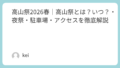 2026年4月14日(火)・15日(水)に行われる春の高山祭(山王祭)は、豪華な屋台、からくり奉納、御巡幸、夜祭りまでそろう、飛騨高山を代表する春の大イベントです。ただ、実際に行くとなると「何時に行けばいい?」「車で行って大丈夫?」「駐車場...