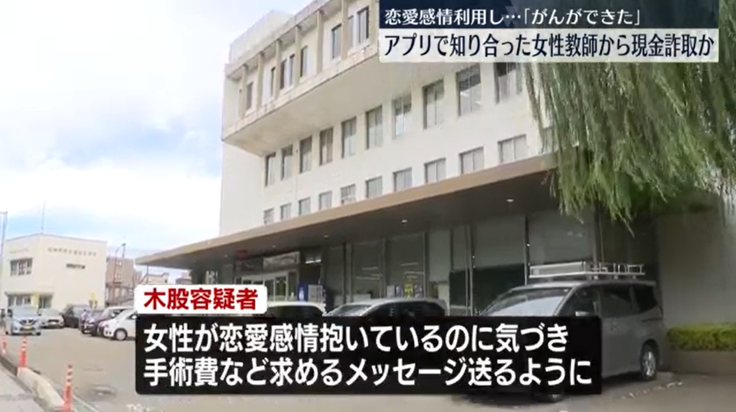 岐阜県の木股淳一容疑者(35)は、神奈川県相模原市の50代女性教師に「がんができた」「お金がない」と嘘をつき、約94万円をだまし取った疑いで逮捕されました。フリマアプリを通じて知り合い、直接会ったことはなかったという関係性の中で、女性が恋愛感情を抱いていたことを利用したとされています。