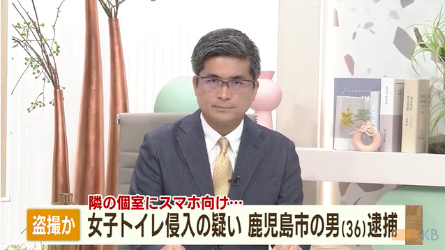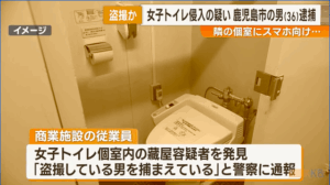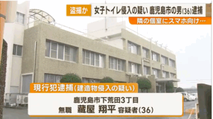 2025年10月13日、鹿屋市の商業施設の女子トイレに侵入した疑いで鹿児島市下荒田3丁目の無職・藏屋翔平容疑者(36)が現行犯逮捕されました。