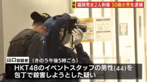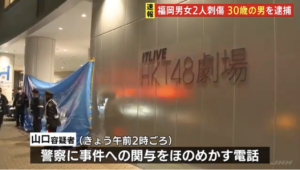 福岡市の商業施設で行われていたHKT48のイベント中、スタッフと一般来場者の男女2人が刃物で刺される事件が発生しました。